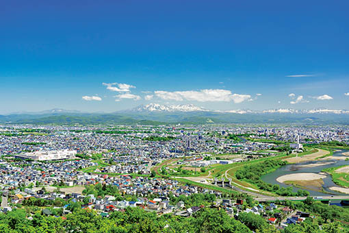 大雪山連峰の雄大な姿に包まれた街の中央には、石狩川がゆったりと流れています。