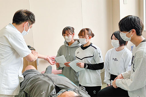 入学して間もない1年次の春に近隣病院での臨床見学授業を実施。病院スタッフとの情報・意見交換、教員による実際の治療場面を見学することで、療法士をめざす目的の再確認はもちろん、学習意欲の向上にもつながっています。
