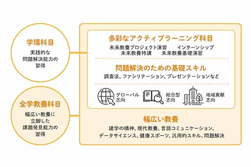 未来教養基礎演習、未来教養特講、サステイナビリティ入門、未来教養概論、量的調査法、質的調査法、プレゼンテーション入門、ファシリテーション入門、多元的共生社会論、未来教養プロジェクト演習ほか