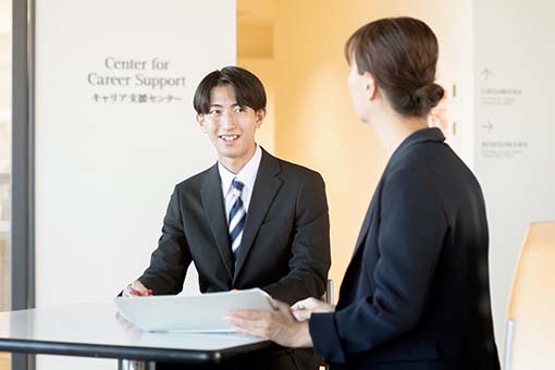 なぜICは就職に強いのか?キャリア支援センター(通称:キャリセン)のスタッフによる、学生一人ひとりのアクションプランからメンタル面までをきめ細かにサポートする体制が、その実績を支えています。「共に生きる」というICの理念が、就職活動においてもあなたを支援します。