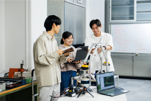 4年間の中で多くの課題解決型の授業や実践的なプログラムに取り組み、4年次の卒業研究ではあなたのやりたい自由な研究テーマにチャレンジすることができます。