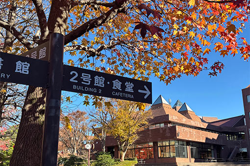 私のお気に入りは、図書室を出てすぐ目の前に広がる中庭です。春は色とりどりの花が咲き、夏は青々とした緑が爽やかで、秋には赤や黄色に美しく色づく紅葉が楽しめます。冬は葉が落ちて一面に落ち葉が広がり、まるでカーペットのような景観になります。四季の移ろいを感じられるこの中庭は、文教大生にとって心休まる憩いの場です。