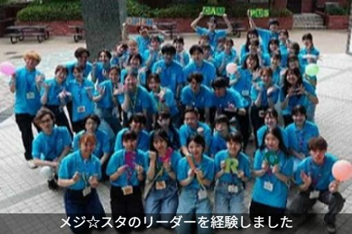また、多種多様な学部が存在するこの大学において「メジ☆スタ」という学生団体に加入したことで、さまざまな人と関係を構築することができました。気さくな職員の方とたくさんコミュニケーションできるのも新鮮で良い経験です。