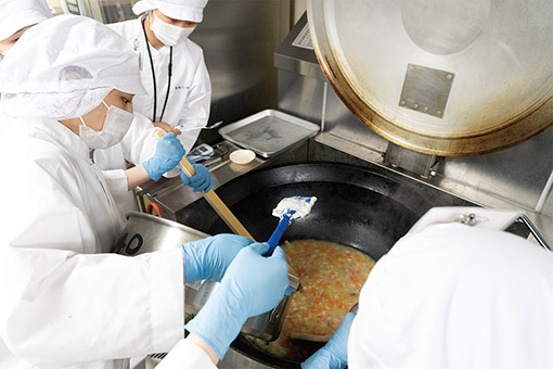 栄養価的に十分な献立がつくれるだけでなく、人の心を満たすおいしさまで提供できるように、数多くの実習を採用し、一人ひとりの調理技術を磨いていきます。