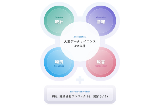 データサイエンスのための技術(統計と情報)、それを社会で応用するための知識(経済と経営)を4つの柱として体系的に学びます。