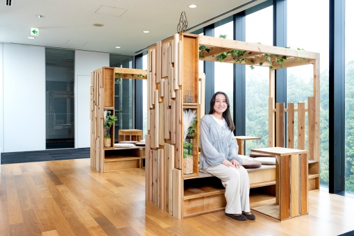 産学連携課題コマジョデコール2025では「わたしたちの居場所」をテーマに、廃棄予定の材料を用いて大学施設内に学生の居場所をつくる課題に取り組みました。審査・協議の結果、私が提案したバーゴラ付きのベンチとサイドテーブルが3つの居場所の中の一つに選定され、制作にご協力いただく建設会社との打合せや連携企業からの材料提供の協力を経て、グループワークにより作品を作り上げました。提案から完成までの実務にかかわる貴重な経験ができたと感じています。将来は、大学での学びを活かしてクライアントの思いに寄り添ったプランニングや提案をしたいと考えています。