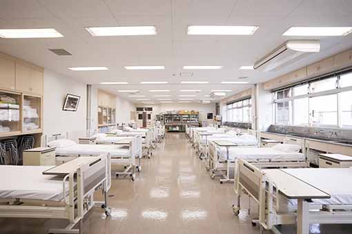 養護実習室を紹介します。ここには、保健室に置かれているようなベッドや車椅子、医療用具などの物品がそろっており、私は基礎看護学実習でこれらを使用しました。バイタルサインの測定や足浴などの清潔ケアを実践する中で、現場で求められる手順や注意点を学ぶことができました。また、患者役の人との実践を通して、声かけのしかたや安心感を与えるコミュニケーションの重要性も実感しました。こうした経験は、将来、養護教諭として子どもたちの健康を支える上で大変貴重な学びとなりました。