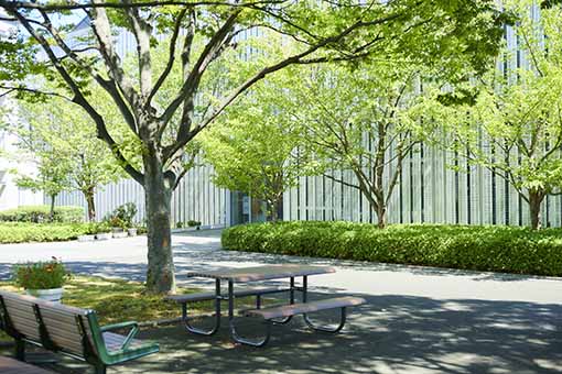キャンパス内には緑が多く、四季の移ろいを楽しめる環境が整っており、とても心が癒されます。施設も充実していて、友達と楽しく過ごすことはもちろん、1人で集中して自習することもできる、快適な学習環境が整っています。