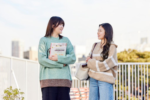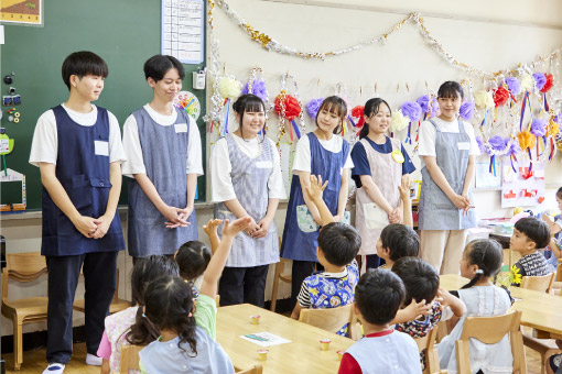 キャンパスには幼稚園が隣接しており、常に保育者の仕事がイメージできる環境で学ぶことができます。実体験を通してこどもを観察し、親しく触れ合い、さまざまな関わり方を試すことによって、保育者としての資質が磨かれていきます。また学生たちは、元気なこどもたちをいつも身近に感じることで、高いモチベーションを保ち、幼児教育・保育の学びに励んでいます。