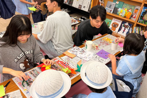 大学の学園祭である「宝仙祭」には、隣接する幼稚園・小学校からたくさんのこども達が訪れます。学友会(大学の行事を運営する組織)に所属する学生を中心として、こども向けの工作や紙芝居、ボールプールやヨーヨー釣り、スタンプラリーなど、こどもが喜ぶ出し物を数多く出店し、学園祭の中でもこどもとの接し方など保育や幼児教育について学びます。