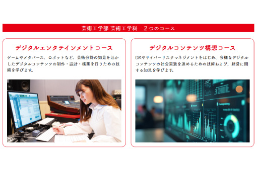 芸術工学部〈仮称〉*では、デジタルエンタテインメントコース〈仮称〉*とデジタルコンテンツ構想コース〈仮称〉*の2コースを設置する予定です。