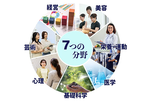 「美容」「栄養・運動」「医学」「基礎科学」「心理」「芸術」「経営」の7つの学問分野を横断的に学び、実践の裏付けとなる科学的な視点を養成。心と体の美しさを探究する研究活動にも力を入れ、現場の技術やサービスに対して「なぜそれが効果的なのか?」を理解できる力を育てます。4年間の学びの中で、現代の多様なニーズに対応できる知識を深め、時代に応じた柔軟な視野を広げます。