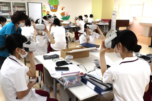 今、在宅医療や急性期医療を支える、高度な判断力・実践力のある看護師が求められています。長岡崇徳大学は、全国でも先駆的に地域包括ケアに取り組んできた法人に属する大学であり、大学周辺にはその関連施設が隣接し、医療や福祉が必要な方々と近い環境で専門的に学ぶことができます。また学内の教育設備として、学生2名に対し1台のVRヘッドセットを設置し、患者さんの状態を再現できるシミュレーターと共に積極的に演習で活用しています。またVR教材を活用するだけでなく、実写版のVR教材開発を全学的に推進し、患者さんや医療者の視点から臨床場面を体験し、観察や判断力の育成につなげています。