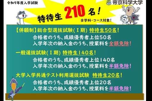【併願制】総合型選抜試験(Ⅰ期)、一般選抜試験(Ⅰ期)および大学入学共通テスト利用選抜試験の合格者のうち、学部・学科(コース)を問わず、下記に該当する方を特待生とします。