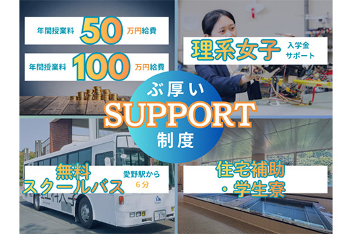 生活・進学サポート: 最寄駅からの無料スクールバス運行や住宅補助制度により、日々の通学や生活の負担を軽減。さらに、より高度な専門性を追求できるよう、大学院の学費を低く設定しています。