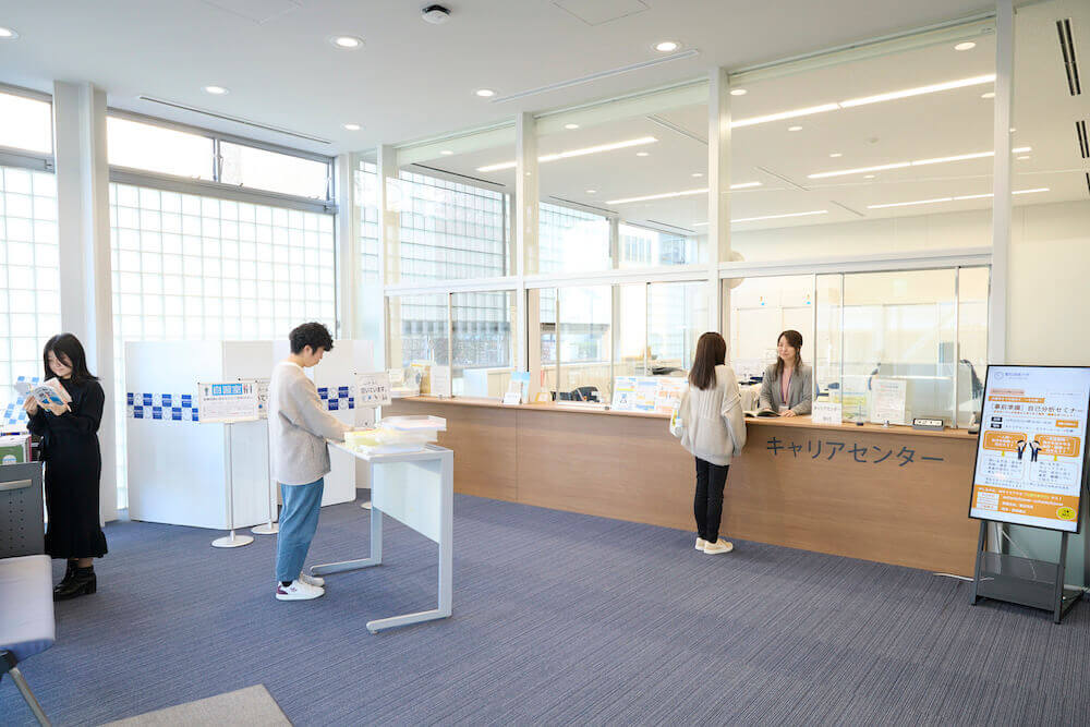 キャリアセンターは「キャリア教育」と「キャリア支援」の二つの側面から進路支援をおこなっています。キャリア教育では、社会で必要な知識やスキル、社会人になる心構えを学ぶ科目を豊富に用意。キャリア支援では、個人面談や各種ガイダンス・セミナーなどのプログラムをおこなっています。国家資格を持つキャリアアドバイザーからの一人ひとりへのサポートも実施。経験豊富なスタッフの支援により、高い就職率につながっています。