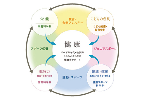本学は、「健康」を軸として「こどもの成長」「栄養」「運動・スポーツ」を学び研究することのできる4つの学科があります。さらに、「スポーツ栄養」「食育・食物アレルギー」「ジュニアスポーツ」などをキーワードに、学科の枠を超えた学びのコラボレーションも実現。それぞれの相乗効果によって専門分野にプラスαの知識と能力を備えた指導者を養成します。