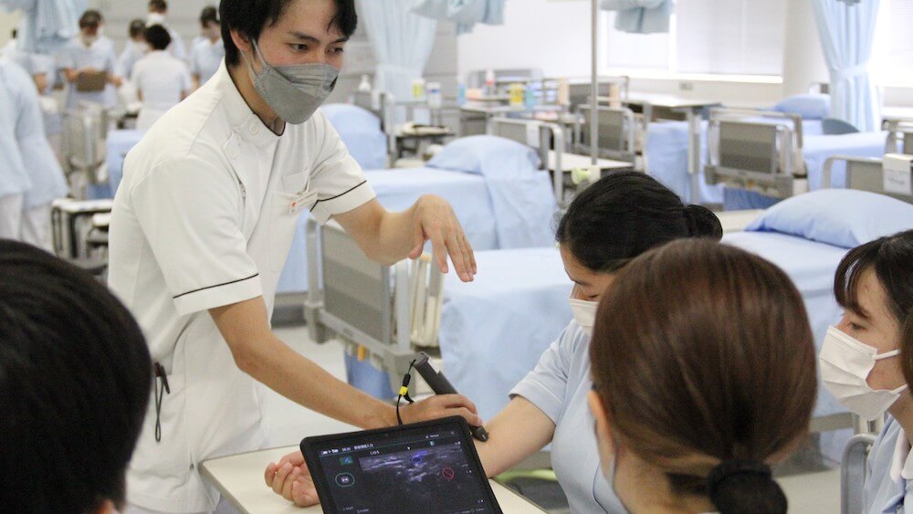 本学は80余年の歴史で培われた確かな看護教育、そして単科大学として看護教育に特化した設備・教材を揃えており、看護の知識と技術をしっかりと学ぶことができます。看護技術を学ぶ看護実習室は県内有数の広さ・多さを誇り、20台以上のベッドを備えた基礎看護学実習室や自宅での看護を想定し和室を備えた在宅看護学実習室など、看護領域毎に設置されています。看護実習室は常に開放され、学生は自由に予習復習ができます。また、DXを推進し、脈拍・SpO2・肺音等の生体反応を示すハイブリッドシミュレータや、血管等の皮下組織の深さ・位置を可視化できるエコーなど新しい機材・教材を導入しているため、より実践的な学びを深めることができます。