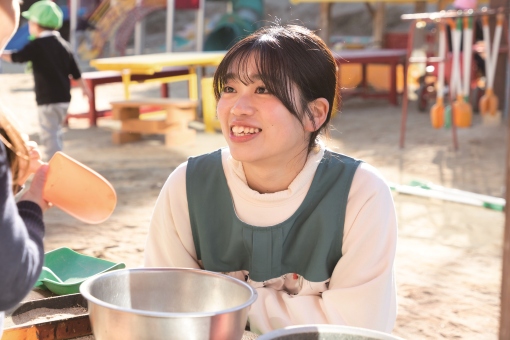 多様化する保育現場において子ども一人ひとりの思いを受けとめ、寄り添うことができる保育者をめざします。幼稚園・保育所での実習がスタート。子どもたちとふれあいながら体験的に保育を学びます。子どもの発達や保健、食と栄養など、子どもを多角的に学ぶ授業で保育計画の立て方から展開方法まで現場で必要な具体的スキルを身に付けます。