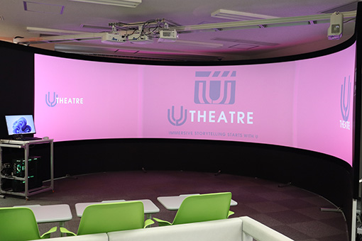 高性能デスクトップPCが設置され、好きな時間、好きなスタイルでICT機材を使った学習ができます。併設するラボスペースには直径5メートルの半円状スクリーンを持つ「Uシアター」を備えており、没入型VR体験ができます。