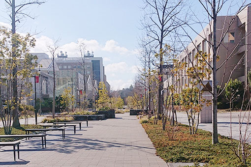 キャンパスの中心を歩いてもらいたいです。とくにキャンパスプロムナードと呼ばれている両側に建物が並ぶメインストリートは、散歩にも最適なエリアになっています。私も授業の時にはこのプロムナードを通って、軽やかな木々とささやかに流れる水場の真ん中を歩いて自分をリフレッシュさせながら教室に向かいます。ところどころにあるベンチで学生たちがノートを広げていたり休んでいたりする光景も授業期間では見られます。