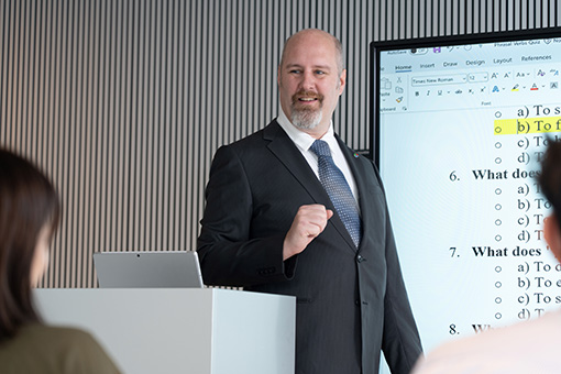 習熟度別クラスの丁寧な指導によって1年次からTOEICを受験し、着実にレベルアップしていくカリキュラム。学びの集大成ともいえる4年次の科目「卒業研究制作」では英語でのプレゼンテーションを行います。4年間の英語学習を通して、実務で活かせる「実践的な英語力」が身につきます。将来はグローバルに活躍することができ、また海外での就職も実現できます。