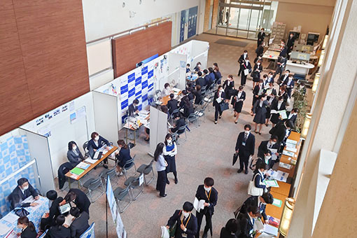 兵庫医科大学が設立した連携病院の会の全面協力により、会員病院による就職のための「合同病院説明会」を、薬学部・看護学部・リハビリテーション学部の学生を対象に開催しています。この説明会では会員病院がキャンパス内に各ブースを設け、一度に多くの興味ある病院の説明を聞くことができます。就職活動を行う該当学年以外の学生も参加できるため、早い段階から自身のキャリアを考え、将来に対するモチベーションを保つことにも役立っています。