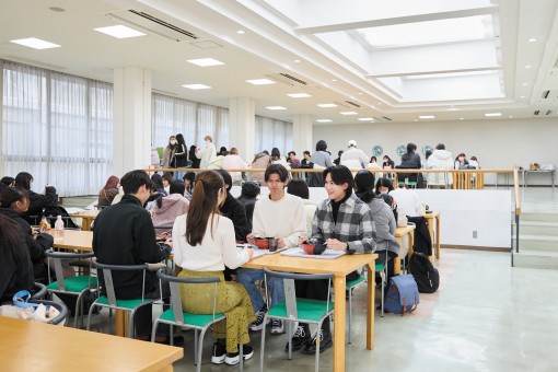 お昼休みは多くの学生が食事をしたりおしゃべりを楽しんでいます。
