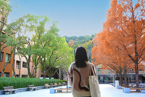 私のお気に入りスポットは、女子学生専用の「こまちルーム」です。ガラス張りの開放的な空間で、一人で勉強するにも空き時間に友達とリフレッシュするにもぴったりです。夏のオープンキャンパスでは女子カフェもやっているので、ぜひのぞいてみてください。もう一つ、中庭もおすすめです。秋晴れの日は紅葉と青空のコントラストがきれいで、思わず立ち止まって眺めてしまいます。図書館で勉強した後に外に出て見上げると、とても癒されます。