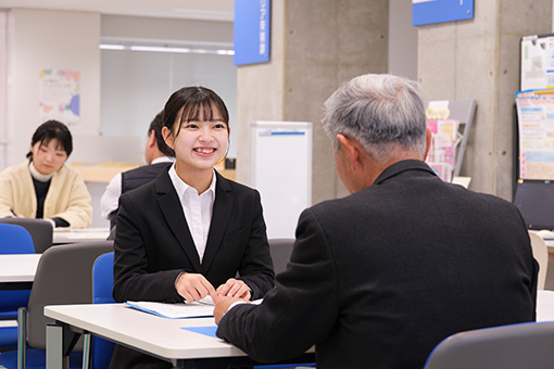 「就職支援」は、エントリーシートや履歴書の書き方指導をはじめ、集団面接や集団討議、個人面接に至るまで全面的に就職活動を支援しています。外部から臨床心理士やハローワークなど就職の専門家を迎えた講座も設定しています。