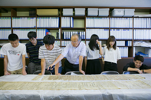 古代から現代にいたるさまざまな作品や資料を対象として、多角的に読み解いていきます。その際、活字化された本(洋装本)のみならず、各時代に書写されたり、刊行されたりした生の資料(和装本)を実際に手に取って読むこともあります。本大学の図書館には豊富な貴重書が収蔵されており、充実した環境で学べます。