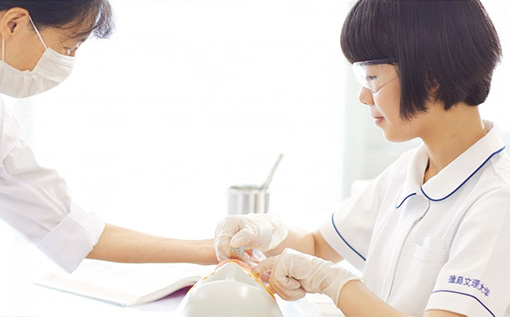 歯科衛生士の3大業務(歯科予防処置・歯科診療の補助・歯科保健指導)を中心に、専門分野を学んでいきます。歯科医師・歯科衛生士としての豊富な経験を持つ熱心な教員がそろい、学生1人ひとりに合わせて親身になって指導を行います。国家試験の全員合格をめざすのはもちろん、卒業後はどんな現場でも活躍できる知識・技能・態度を習得できるように、教員全員でサポートを行っています。