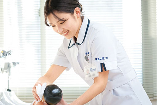 学内では、高機能シミュレーター(さまざまな生体反応や病態モデルを作り出すことができるマネキン)を活用した技術演習により確かな技術を修得します。また、臨地実習などで使用する「実習支援センター」を徳島赤十字病院の敷地内に設置するなど、実習もサポートします。早い時期から医療現場を体験することで医療人としての自覚を深めます。