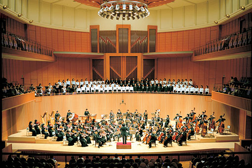 客席数1314席。世界で4番目の設置となった大型キャノピー(可動式音響反射板)を持ち、最適な音響効果が得られる本格的なホールです。毎年秋には音楽学部の学生による定期演奏会が開かれています。また国際的に活躍している演奏家や指揮者を招いた演奏会も行われています。