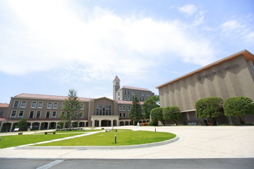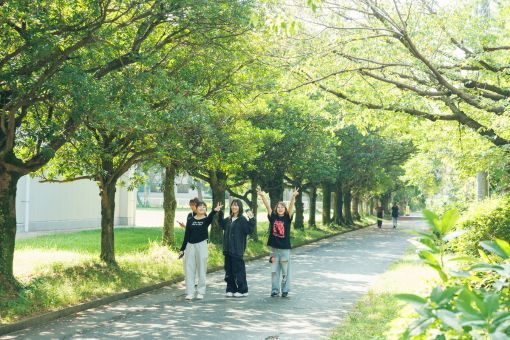 福岡市に位置する曰佐キャンパスは、敷地面積約12万㎡の広さを誇ります。同キャンパス内に、幼稚園、中学・高校・大学院が併設されており、いつも活気で溢れています。都心部に近い立地ながら、「緑あふれるキャンパス」が特徴で、四季の移ろいを肌で感じることができます。また、安心して学生生活が送れるように、セキュリティーのしっかりとした学内寮や指定アパートも用意しています。さらに、2022年より体育館や宿泊寮、食堂などをリニューアルオープンし、4年間快適な空間で過ごすことができます。