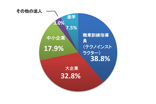 学生の希望に寄り添ったきめ細かい就職支援を行っています。卒業生の4割が公的機関の職業訓練指導員、5割が民間企業に就職し、1割が国や県の公務員(職業訓練指導員以外)や公益法人、大学院に進学しています。