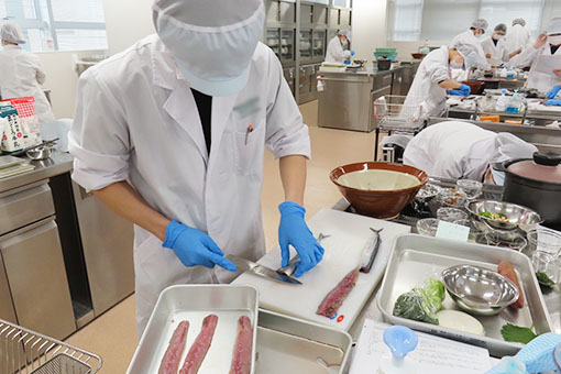 現在は給食管理実習に力を入れて取り組んでおり、栄養士・管理栄養士に必要な衛生管理や献立作成(栄養価・原価計算)を学んでいます。さらに調理実習では和・洋・中を幅広く学び、現役のプロからは技術だけでなく、仕事に向き合う姿勢も学んでいます。