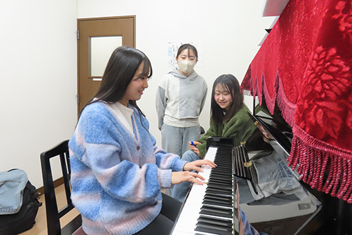 私の好きな場所は、キャンパスの中庭です。みかんやきんかんなど実のなる樹木があり、緑に囲まれたスペースは私にとって癒やしの場です。陽あたりがよいので、ベンチに座っているだけで心地よく、落ち着いて過ごすことができます。また、ピアノ室もお気に入りで、授業が空いている時間に自由に使うことができるので、ピアノの自主練習がたっぷりできます。