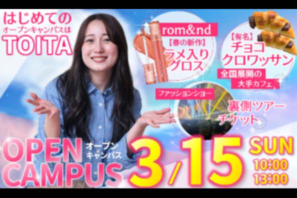 ビューティゼミの学生が美容部員になり、最新コスメの使い方やメイクテクニックをレクチャーします。参加者にはメイクアドバイスシートをプレゼント♪TOITAのオープンキャンパスで可愛く変身しよう!