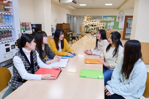 本学は、1学年50人、教員1人当たりの学生数は11.9人(2024年度実績)という少人数教育を実践している大学です。保育科の単科大学なので、保育者を志す仲間と2年間一緒に学ぶことができます。演習科目は25人ずつでの受講が基本で、さらに少人数の授業もあります。また、1学年が複数のグループに分かれ、各グループを1人の教員が1年間担任するグループ担任制を採用しているため、学生が教員に気軽に相談しやすいアットホームな環境が整っています。