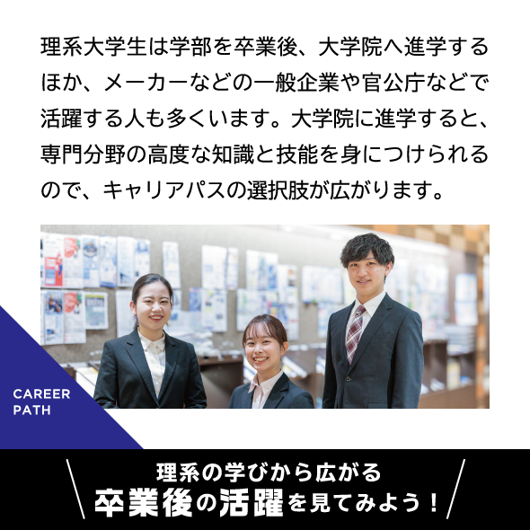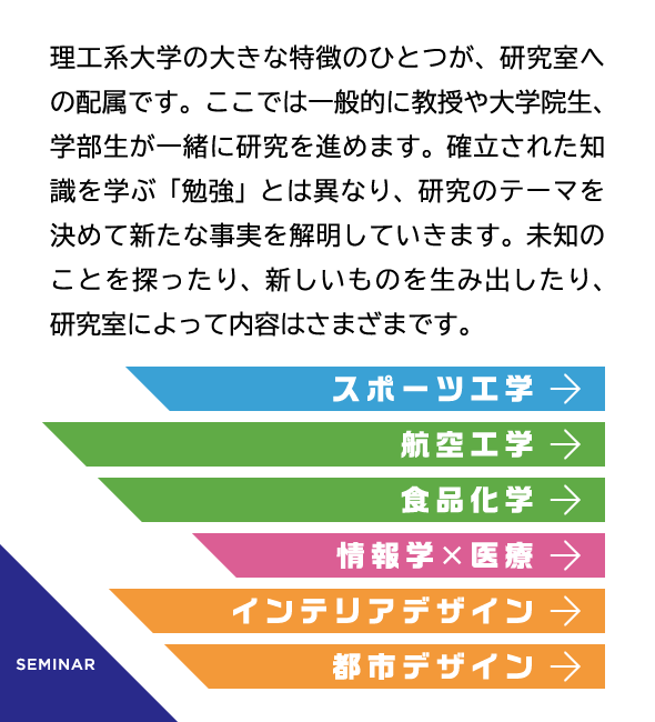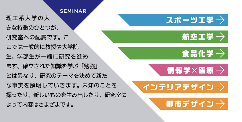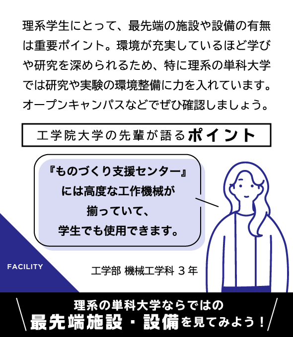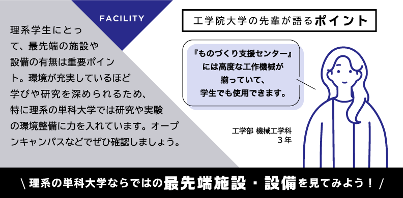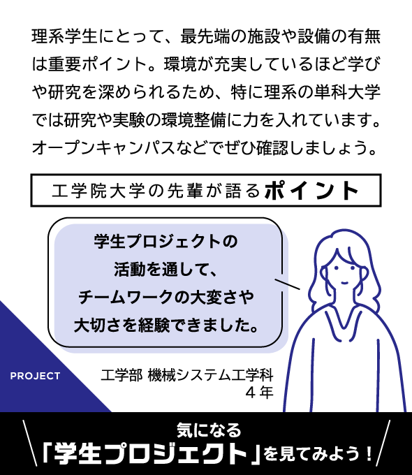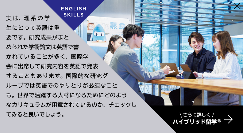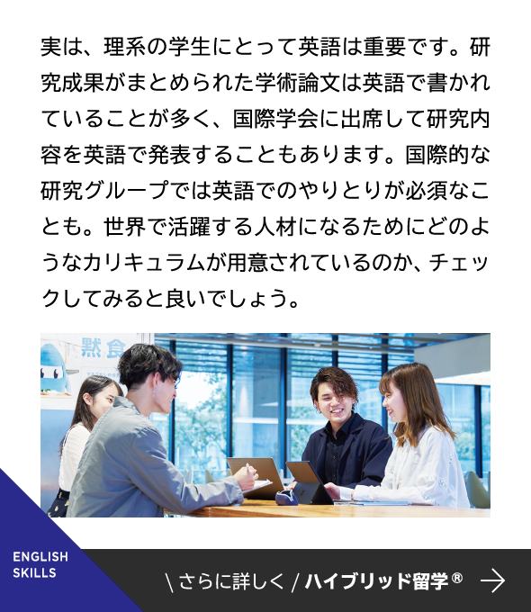 最新設備を導入し、さまざまな実験が可能な先進工学部の研究・実験拠点が4号館に設けられています。講義室や、物理・化学の実験施設など柱のない広い空間構造に加え、天井モニターや可動式のアームダクト、ドラフトチャンバーなどが装備され、充実した研究・実験を後押ししています。
