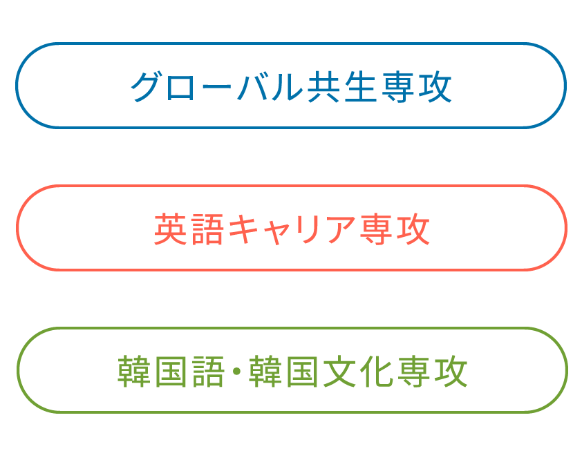 さらにくわしい情報はグローバル社会で多様な人々と協働・共創できるよう学ぶ「グローバル共生」、高い英語コミュニケーション力を身につける「英語キャリア」、韓国語や歴史・社会・文化等の観点から韓国を学ぶ「韓国語・韓国文化」の3専攻を横断し、幅広く学ぶことができます。