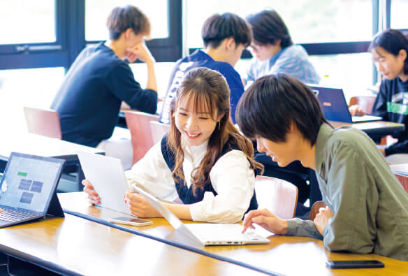 学びのフィールドは、文化・観光・コミュニケーション・ビジネス・クリエイティブの5つの分野にわたります。堅苦しく考えなくても大丈夫。デザイン、音楽、観光、SNS、映像、メディア、データサイエンスなど高校生にとって身近なテーマの授業が多いので、自分の「好き」をきっかけに各領域を体系的に学んでいけば、着実に未来のシゴトにつながります。